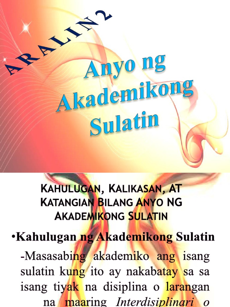 16102016 Akademikong Sulatin Layunin at Gamit Katangian. Ang sulatin na ito ay isang pangangailangan para sa mga akademiko at propesyonal. Pagbibigay katuturan sa konsepto o.