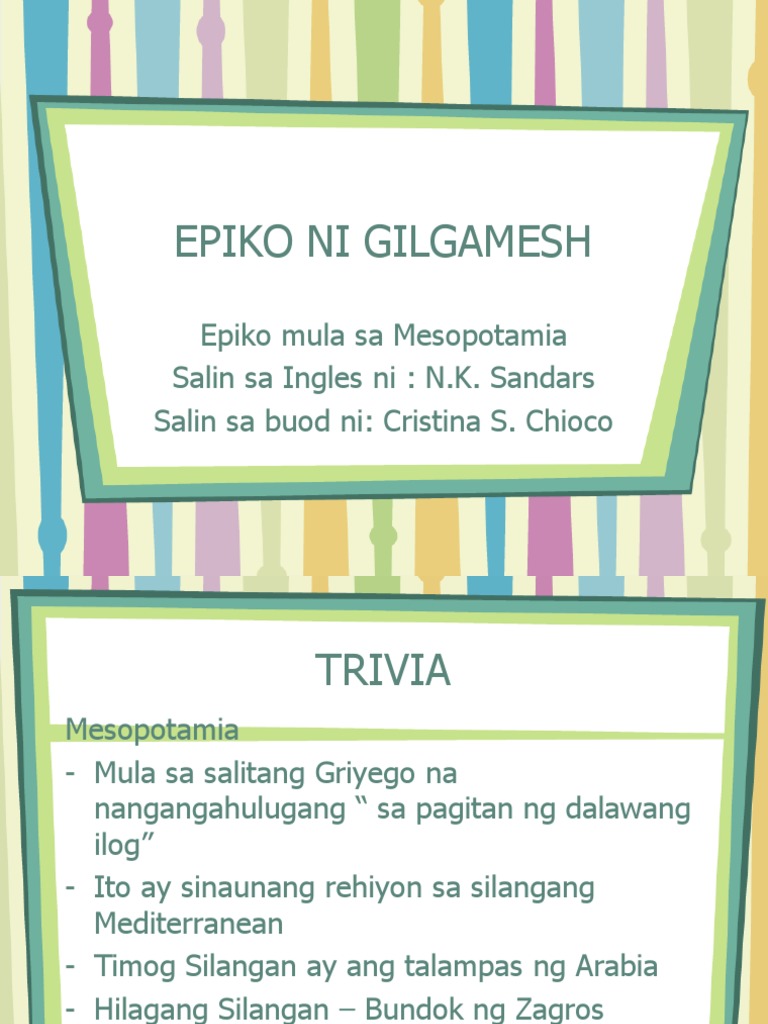Epiko ni Gilgamesh isang epikong patula mula sa Mesopotamia na kinilala bilang kauna-unahang dakilang likha ng panitikan Nagsimula kay Homer ng Greece ang tradisyon ng epiko sa Europa noong 800 BC. Epiko ni gilgamesh slideshare. Agad ipinapasa ni Lanie sa iba ang natatanggap na forwarded namensahe sa cellphone patungkol sa nangyayari sa lipunan3.