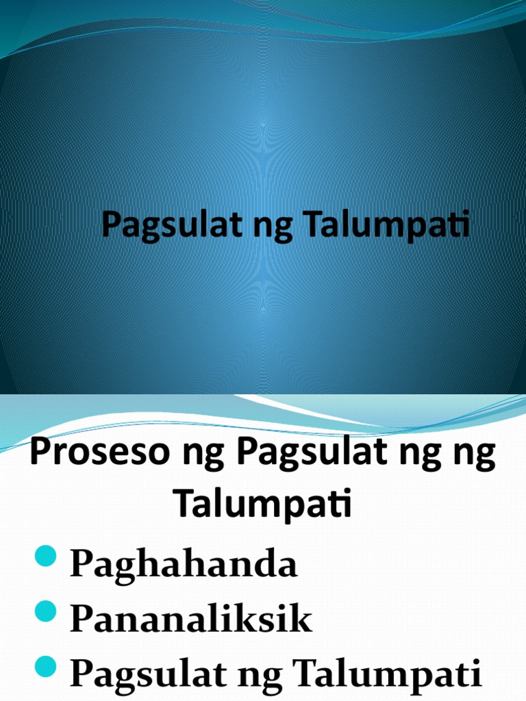 Mga proseso sa pagsulat ng talumpati. Simula pa sa mga sinaunang panahon ang mga talumpati ay naging kritikal sa pag tayo at pagkasira ng mga malalakas na. Pagtukoy sa uri ng tagapakinig- Upang maibigay o maiakma niya para sa mga ito ang paksa. Una Isaalang -alang ang uri ng wika at mga angkop na salita na magiging kaaya-aya at mauunawaan ng mga tagapakinig simulang ang pag sulat ng introduksyon isulat narin ang konklusyon gumammit ng mga tayutay makakatulong ang mga tayutaykasabihan o salawikain na ito.