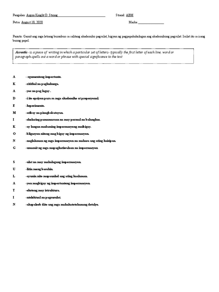 Akademikong pagsulat acrostic. 05022014 Mga halimbawa 1. 09112019 Akademikong Pagsulat Ito ay nangangailangan ng mas mataas na antas ng kasanayan. 14112019 Acrostic poem for eating habit.