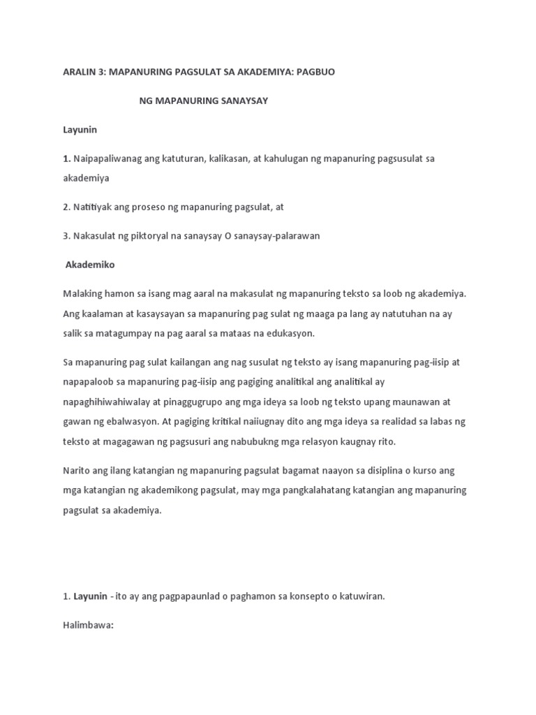 50 4 50 found this document useful 4 votes 2K views 40 pages. Pinakikitid ang isang malawak na paksa. 16072016 Mapanuring Pagsulat at Tekstong Akademiko Layunin Karaniwang pagpapaunlad o paghamon ito sa mga konsepto o katuwiran Hal.