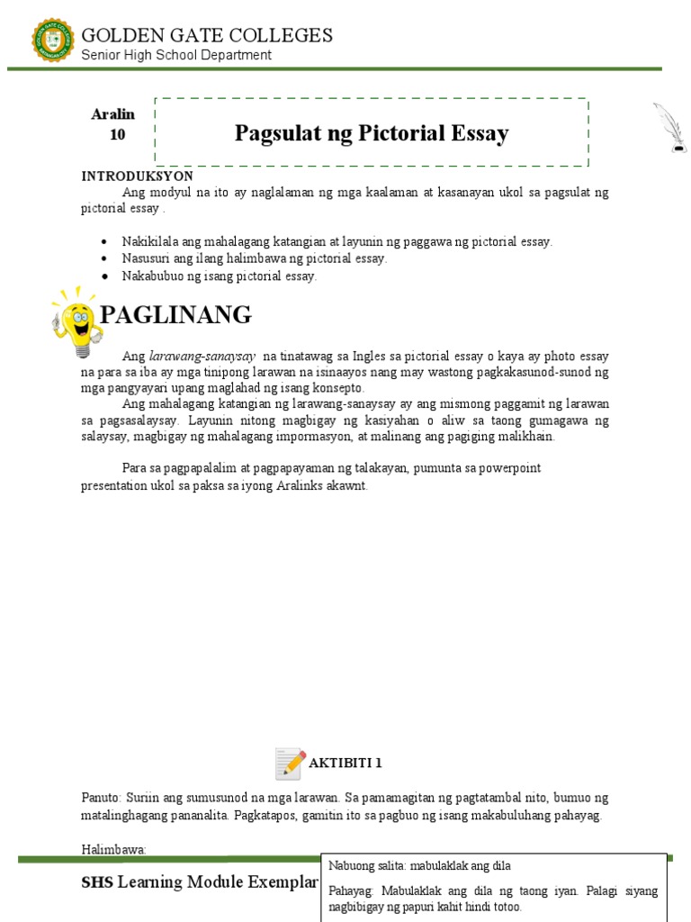 Makasulat ng organisado malikhain at kapani- paniwalang sulatin. Paano makatutulong ang pictorial essay na malinang ang pagiging malikhain ng mag-aaral na tulad mo. Bakit mahalagang ang paksa ng iyong pictorial essay ay nakabatay sa iyong interes.